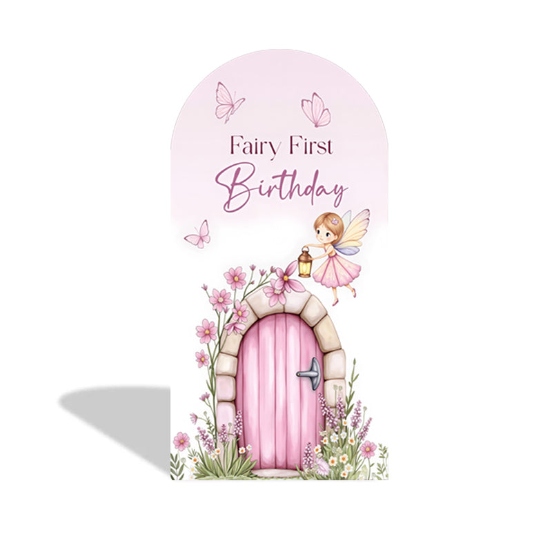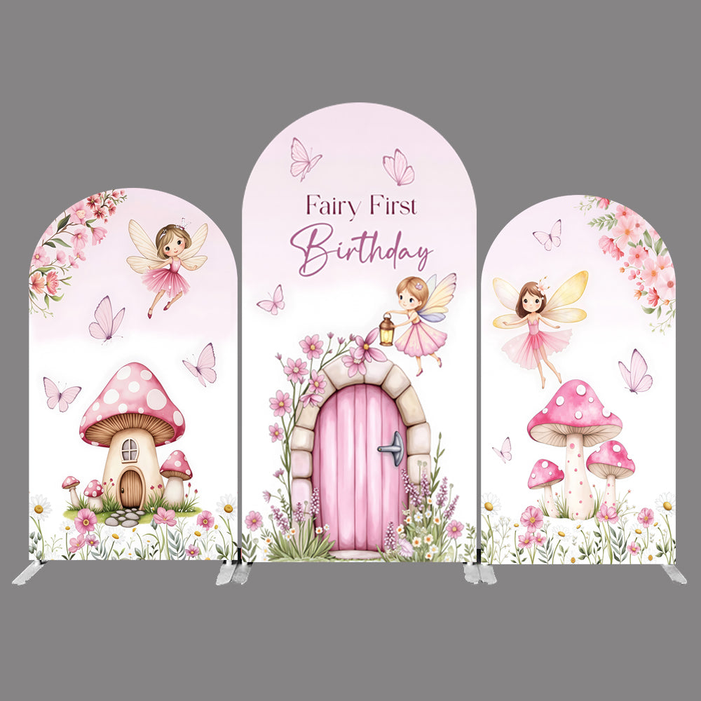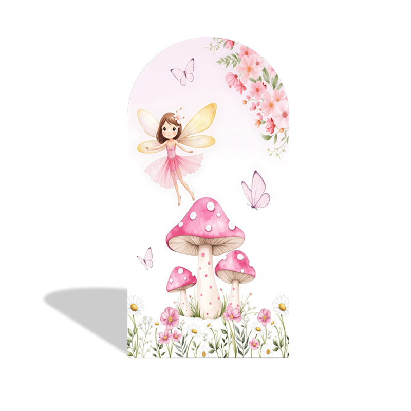 Custom Butterfly Mushroom Photo Backdrop Cover Pink Girls Birthday Party Arch Double Sides Elastic Covers