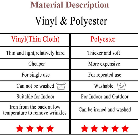 Vinilo: relativamente fino, de color más brillante, apto para un solo uso, no se puede lavar, se puede planchar por la parte posterior a baja temperatura, apto para uso en interiores.